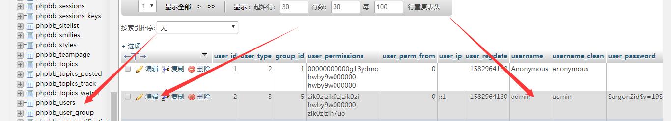 弟一步:登陆到PHPMYSQL管理面板。找到对应的数据库,找到对应数据库下的字段:phpbb_users,然后找到username为:admin的用户,点击编辑。